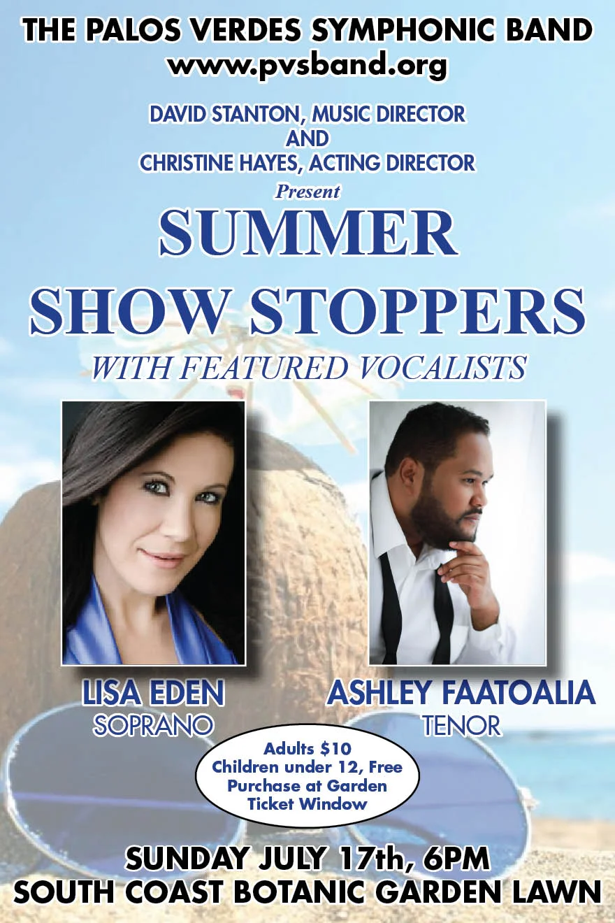 The Palos Verdes Symphonic Band will present its annual Pops Concert, Summer Show Stoppers, on Sunday, July 17th at 6 pm outdoors on the meadow at the South Coast Botanic Garden, 26300 Crenshaw Boulevard in the Palos Verdes Peninsula. Featured vocalists will be guest professionals soprano Lisa Eden and tenor Ashley Faatoalia. Acting music director Christine Hayes will conduct the program.