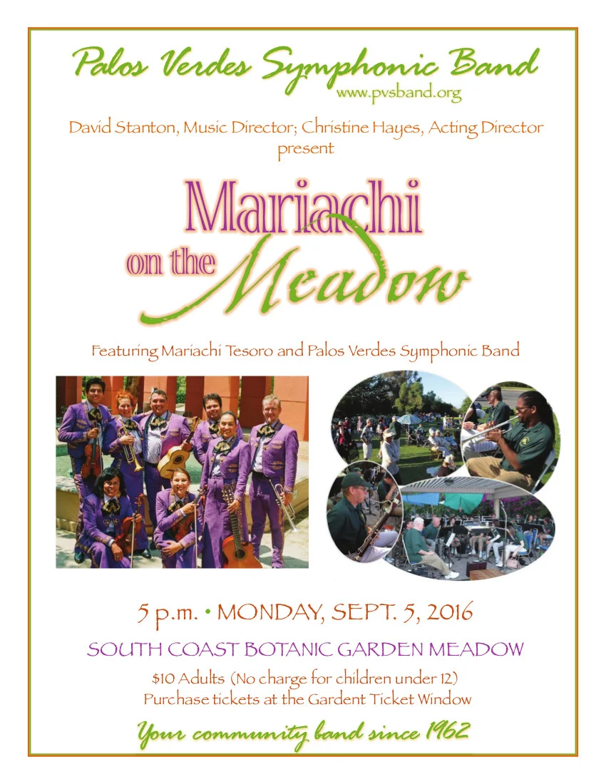 The Palos Verdes Symphonic Band will present its annual Labor Day concert, Mariachi on the Meadow, on Monday, September 5 at 5:00 PM outdoors on the meadow at the South Coast Botanic Garden, 26300 Crenshaw Blvd. in the Palos Verdes Peninsula.