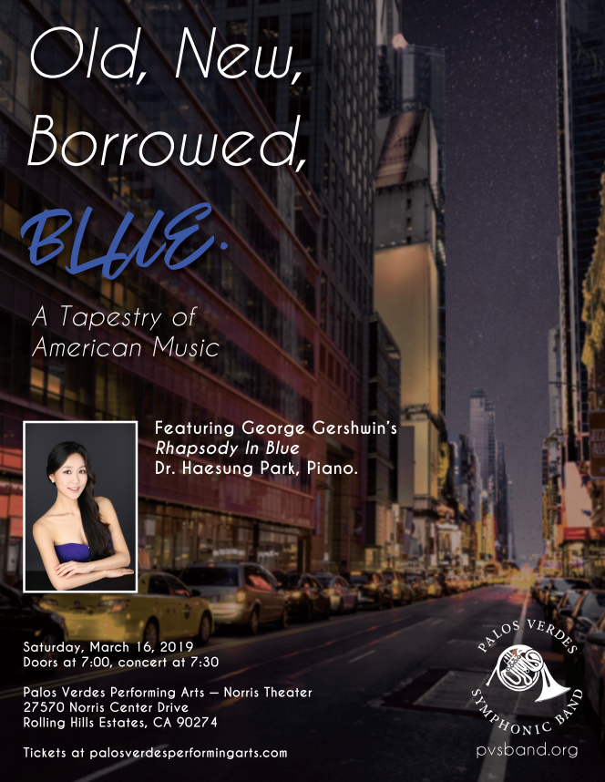 Join the Palos Verdes Symphonic Band for its annual formal spring concert, Old, New, Borrowed, Blue: A Tapestry of American Music, to be presented on Saturday, March 16, 2019 at 7:30 PM at the Norris Theatre, 27570 Norris Center Drive, Rolling Hills Estates 90274. The band will perform works by Charles Ives, award-winning composer W. Francis McBeth, movie and television orchestrator and arranger Julie Giroux, Augsburg College professor Erika Svanoe, and others. Pianist Haesung Park will be featured in a concert band arrangement of George Gershwin’s Rhapsody in Blue.