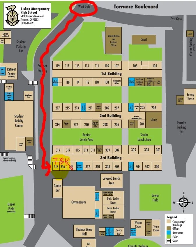 *** Please note that the first two rehearsals on 6/1 and 6/8 will take place at Bishop Montgomery High School in the TBK Rehearsal Room 318 – see directions on the map below. Enter through the main gate at 5430 Torrance Blvd. NO STANDS NEEDED!